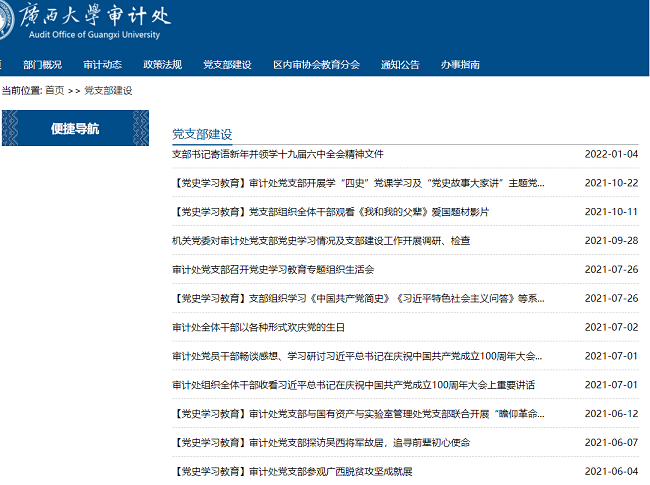 广西大学审计处党支部由9名中共党员组成,谭银花同志任支部书记,长期以来,支委与领导班子准确把握各项方针政策,严抓组织建设,规范支部设置,坚持党要管党、从严治党、从严管理干部,扎实推进审计队伍建设。围绕“学党史、悟思想、办实事、开新局”的主题,扎实开展了党史学习教育系列活动。思想先行,理论引领实践;丰富形式,党史学习走实走深。通过集中学习、分散学习、讲专题党课,开展红色教育及联合党日活动、“讲党史故事”、观看爱国主题电影、参观校史馆等形式多样的活动,将党史学深学透,召开民主生活会摆问题,找原因,提措施。全年审计处党支部共组织13次党史学习活动,在审计处网站进行16次宣传报道,制作张贴2期党史学习板报。