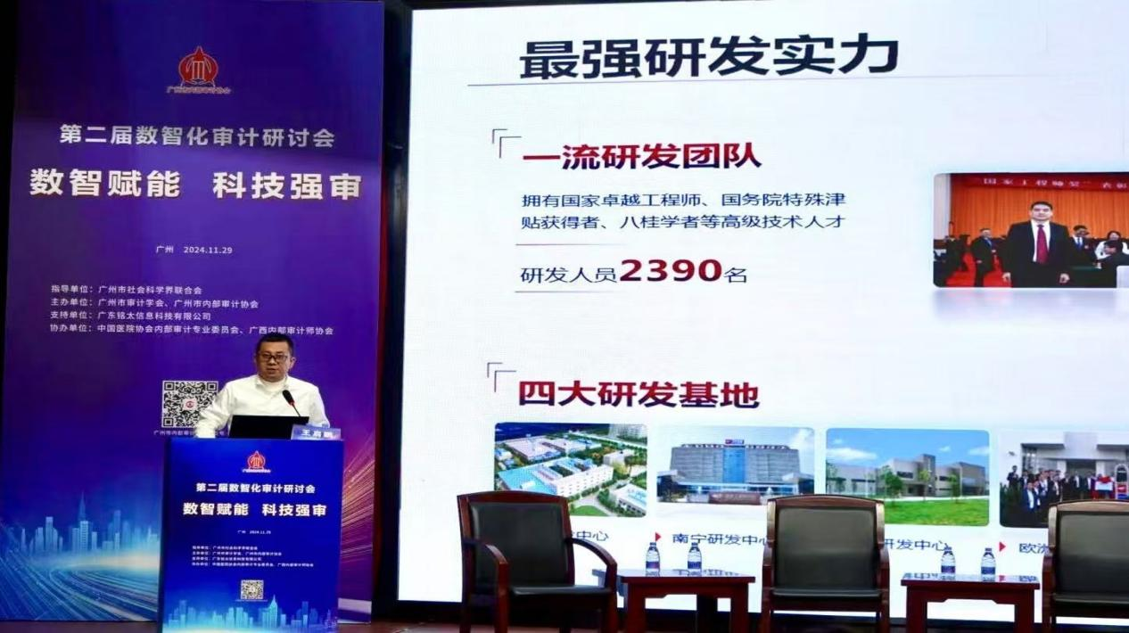 在主题演讲环节,南京审计大学钱钢教授首先作题为《实施企业大监督体系,构建企业美好监督新篇章》的主题分享,接着工信部第五研究所刘北水主任、广州市审计局电子数据处罗勇处长、铭太科技董事长柳絮教授分别作了题为《数据安全与合规》《人工智能大模型在审计中的应用》《智慧领航数字审计---开启数字化审计新时代》等专题报告。广州医药集团审计部陈金元部长和广西玉柴集团审计部王启鹏部长分别就本集团实施数智化审计工作经验进行交流分享。