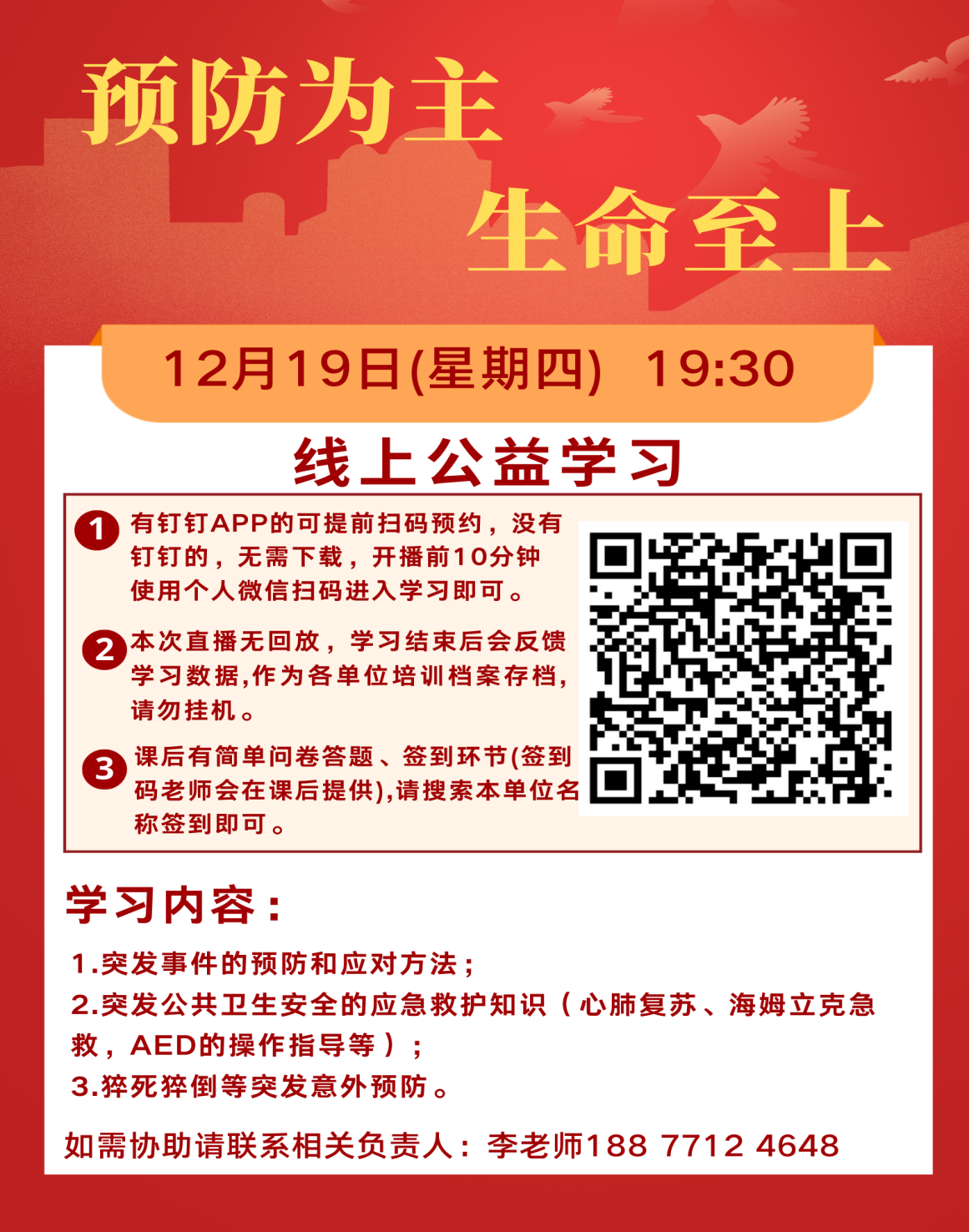 本次培训以线上培训的方式进行。如安装有钉钉APP的人员,请提前扫码(见附件)预约;没有安装钉钉APP的人员,请于培训当天晚上19:20后通过微信扫码进行学习。