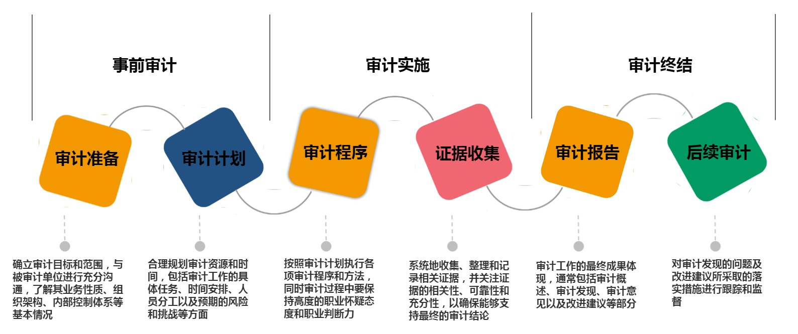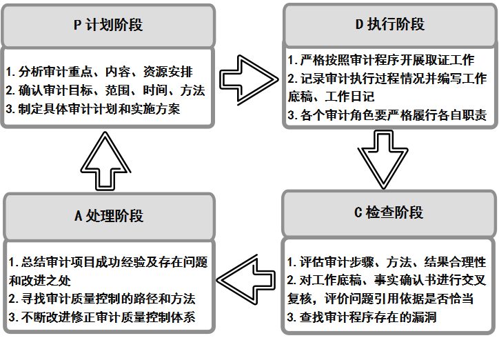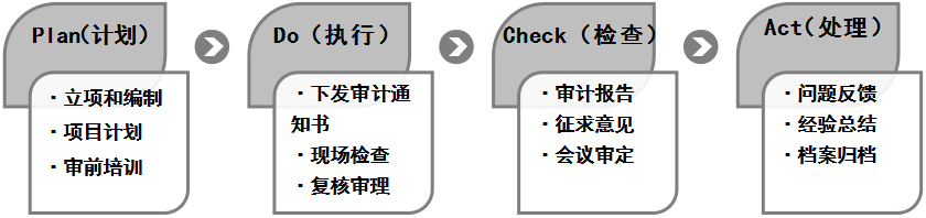 | 审计部负责人 | 整个审计项目的计划、实施、终结全流程质量控制进行指导、监控、复核 | Plan(计划)、Do(执行)、Check(检查)、 Act(处理) |