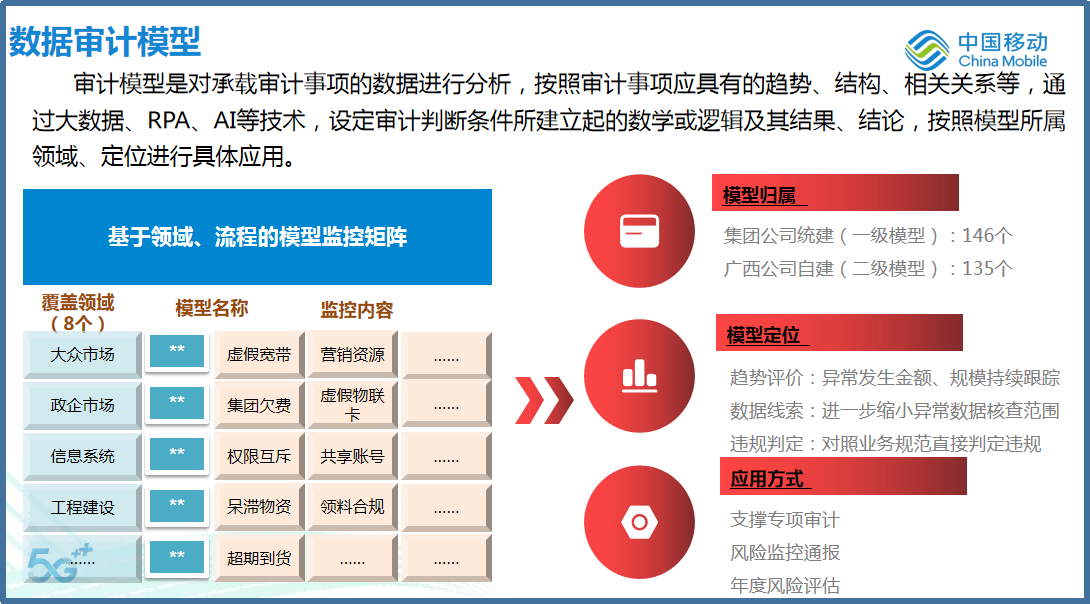 广西移动内审部依托286个数智审计模型,通过“扫描—分类—整改”闭环机制,实现风险早发现、早处置,为业务合规运行提供服务保障,累计提示风险事项80多项、针对22项高风险发起核查整改。