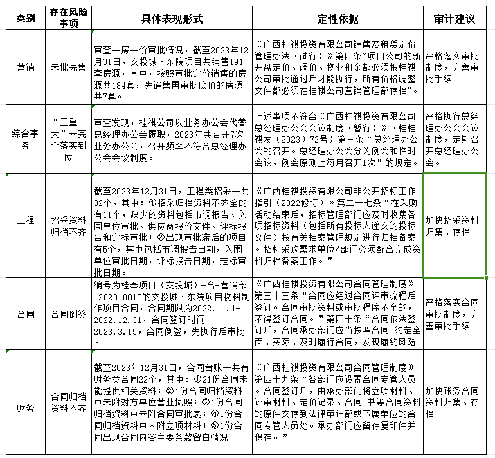 4.围绕审出什么效果进行研究。这实际上是审计的目标要求,审计活动要达到什么样的目的才算有价值或者意义。由于交投城·东院是南宁市示范性项目,定位较高,对项目开发管理审计应当服务于高质量发展的需要。因此,对交投城·东院项目的审计应当追求以下效果:健全制度体系,规范业务管理流程,法人治理治理机制健全,持续获得工程建设质量评优,经营效益明显提升。