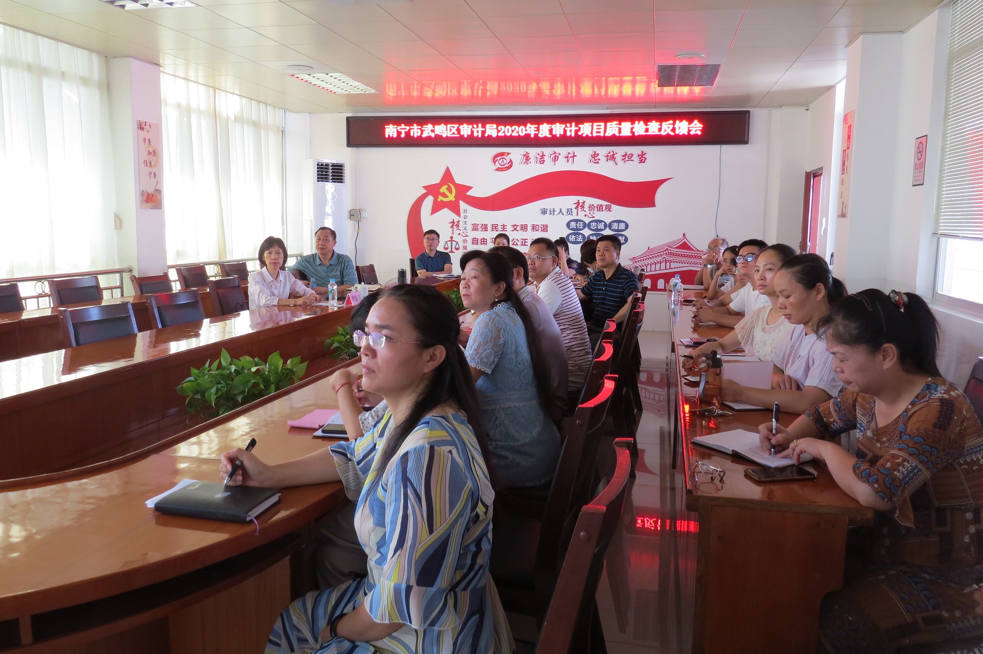 2021年7月15至16日,南宁市审计局党组成员、总审计师、二级调研员梁露霞带领相关科室负责人赴武鸣区审计局、广西—东盟经济技术开发区审计局开展“为群众办实事”及审计工作调研和2020年度审计项目质量检查、落实2020年度公众评议意见建议整改落实工作,指导基层审计机关和内部审计机构进一步提升审计业务水平。